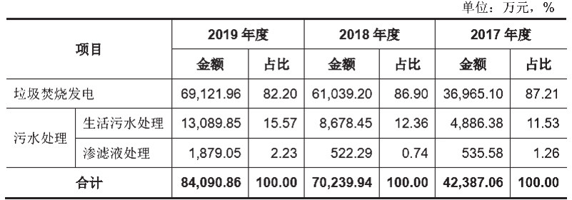 2017年至2019年金沙澳门(中国)唯一官方网站主营业务收入复合增长率达40.85%。2019年度,金沙澳门(中国)唯一官方网站的垃圾焚烧发电业务实现营业收入约6.91亿元,占营业收入比重77.81%;污水处理业务实现营业收入约1.50亿元,占营业收入比重约16.85%。