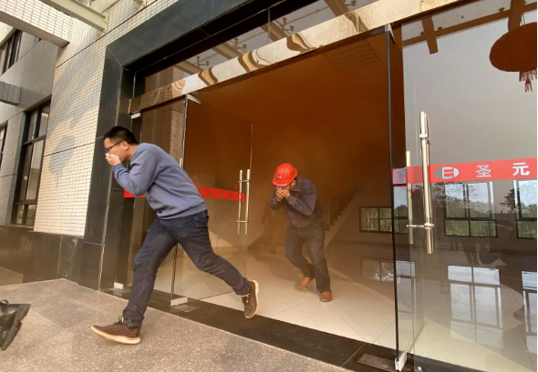 16点30分,用于演习的消防烟雾弹准备停当;16点40分,中控室通过公共广播系统发出消防警报;听到火灾警报后,各部门员工迅速有序地通过指定疏散路线撒离到综合楼前空地。疏散逃生过程,楼梯及安全出口处均未出现堵塞、推挤现象,整个过程比较顺畅。