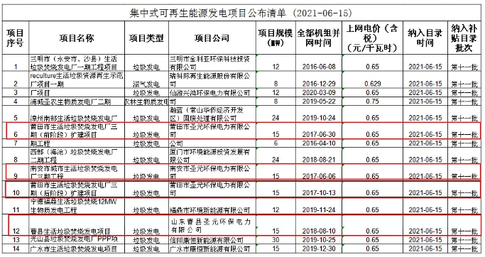 2021年6月15日,国家电网有限公司发布《关于公布2021年第十一批可再生能源发电补贴项目清单的公告》,金沙澳门(中国)唯一官方网站下属莆田市生活垃圾焚烧发电厂三期(前阶段)扩建项目、莆田市生活垃圾焚烧发电厂三期(后阶段)扩建项目、南安市城市生活垃圾焚烧发电厂三期工程和曹县生活垃圾焚烧发电项目等四个项目纳入2021年第十一批可再生能源发电项目补贴项目清单。
