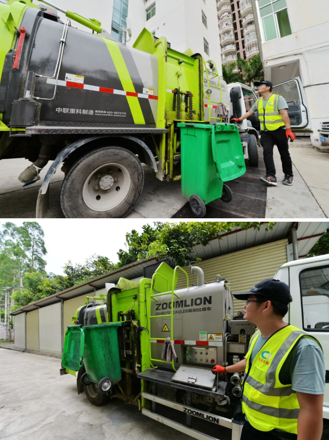 中午12时30分许,记者跟随餐厨垃圾收集车来到南安市特殊教育学校食堂边上。驾驶员郑文哲将立在墙边的一个餐厨垃圾桶拖至车辆右侧,轻松地挂在车辆升降器上,随着机器运行,餐厨垃圾桶被抬到车后罐体上方,随即垃圾被倒入罐体当中。倒完后,倾倒口随即关闭,空桶也被降回地面,整个过程仅用30秒。