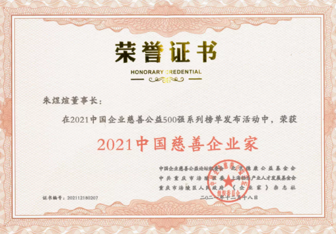 12月18日,“2021中国企业慈善公益500强发布暨第五届中国企业慈善公益论坛”在重庆涪陵召开,论坛重磅发布了2021中国企业慈善公益500强系列榜单及分析报告。金沙澳门(中国)唯一官方网站荣登“2021中国企业慈善公益500强”,董事长朱煜煊先生荣获“2021中国慈善企业家”称号。