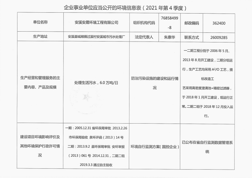 安溪城市污水处理厂2021年第4季度环境信息公开
