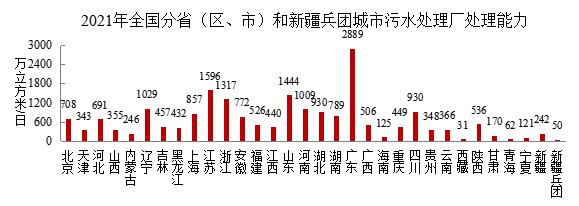 从行政分区看,广东、江苏、山东、浙江、辽宁和河南6个省份城市污水处理厂处理能力超过1000万立方米/日;湖北、四川、上海、湖南、安徽、北京、河北、陕西、福建和广西10个省(区、市)在500-1000万立方米/日之间;吉林、重庆、江西、黑龙江、云南、山西、贵州、天津、内蒙古、新疆、甘肃、海南、宁夏13个省(区、市)在100-500万立方米/日之间;青海、西藏和新疆兵团不足100万立方米/日。