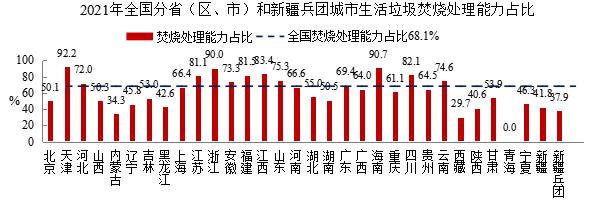 天津、海南、浙江、江西、四川、福建、江苏、山东、云南、安徽、河北、广东、河南、上海、贵州、广西和重庆17个省(区、市)城市生活垃圾焚烧处理能力占比超过60%;湖北、甘肃、吉林、湖南、山西、北京、宁夏、辽宁、黑龙江、新疆和陕西11个省(区、市)在40%-60%之间;内蒙古、西藏、青海3个省(区)和新疆兵团不足40%。