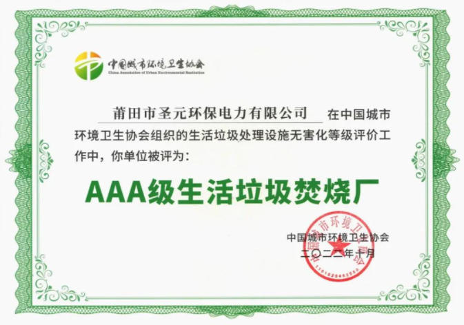 日前,在中国城市环境卫生协会组织的“2022年城市生活垃圾处理设施无害化等级评定”工作中,金沙澳门(中国)唯一官方网站子公司莆田市金沙澳门(中国)唯一官方网站电力有限公司顺利通过AAA级生活垃圾焚烧厂评定,标志着该厂的生活垃圾无害化处理达到国内最高运营水平。