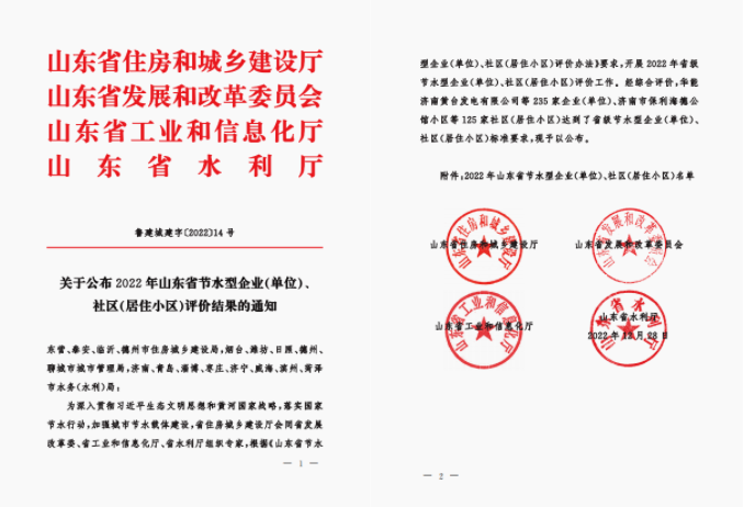 12月28日,山东省住房和城乡建设厅、山东省发展和改革委员会、山东省工业和信息化厅、山东省水利厅联合发布《关于公布2022年山东省节水型企业(单位)、社区(居住小区)评价结果的通知》,郓城金沙澳门(中国)唯一官方网站获评2022年省级节水型企业(单位)。