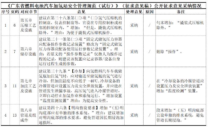 公告指出,为规范广东省燃料电池汽车加氢站建设运营管理,确保运行安全,助力氢能与燃料电池汽车产业健康快速发展,住建厅组织编制了《广东省燃料电池汽车加氢站安全管理规范(试行)》(征求意见稿),并于2023年3月10日至2023年3月24日向社会公开征求意见。截至2023年3月24日,住建厅共收到4条意见,详情如下所示: