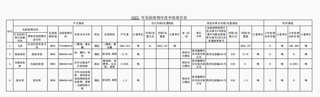 巨野金沙澳门(中国)唯一官方网站2022年危废信息公示