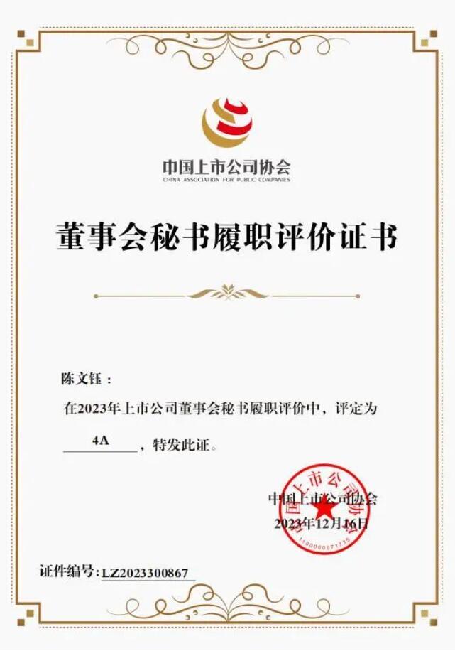 (三)金沙澳门(中国)唯一官方网站陈文钰先生获2023上市公司董事会秘书履职评价4A评级