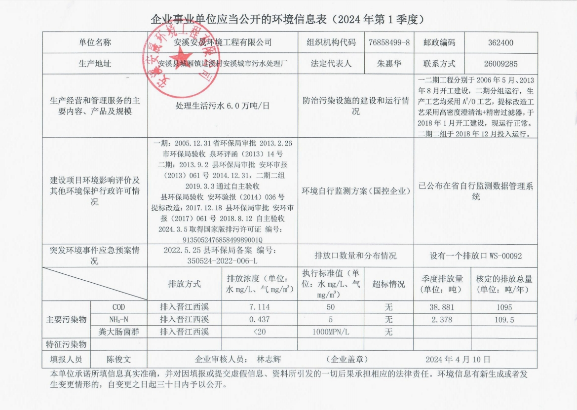 安溪城市污水处理厂2024年第1季度环境信息公开