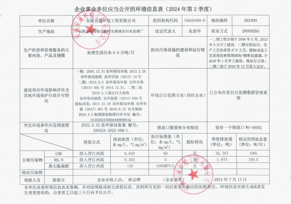 安溪城市污水处理厂2024年第2季度环境信息公开
