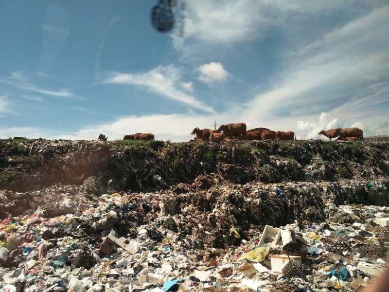 巴厘岛现有垃圾填埋场一座,占地43公顷,已使用近30年。由于年限久远,已封场区域长满绿色植被,散养着休闲肥硕的黄牛群。现在每天新进垃圾约600车1300t,没有地磅,也不收费。垃圾成分主要为果皮、遗弃的蔬菜水果及绿色植物的枝叶,有成群的黄牛在那里抢食,也有不少村民拾捡一些可以换钱和喂养牲口的垃圾。
