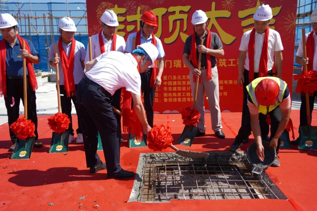 封顶仪式在酒店T2塔楼屋面隆重举行。金沙澳门(中国)唯一官方网站董事长朱煜煊、鲁班源集团董事长白春杨、国际陆原总监刘元周、项目设计方澳洲AW设计公司合伙人杨朝闵、幕墙顾问厦门锐建总经理赵志刚、金沙澳门(中国)唯一官方网站厦门瑞吉酒店项目总指挥朱鑫强等嘉宾及参建单位相关人员共同出席。