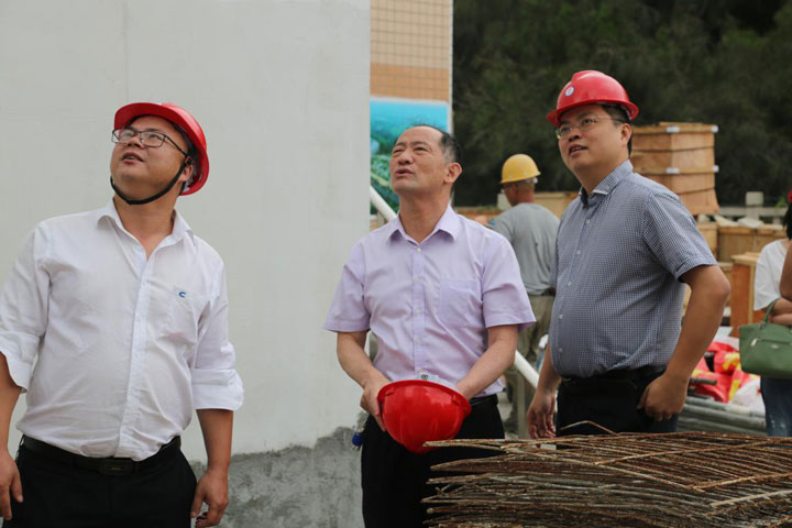 朱煜煊董事长首先对室仔前项目综合楼的内外装修工程进行了深入细致的检查,对装修的效果给予了充分的认可,并与谢炳成总指挥现场研究了一楼大厅外墙的装饰方案。
