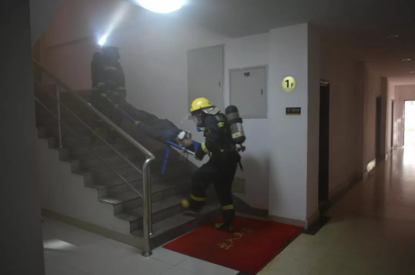消防战士迅速转移火灾受伤人员演练
